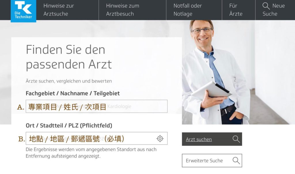 - 按下灰底的 “Arzt Suchen”,搜尋符合條件的醫生